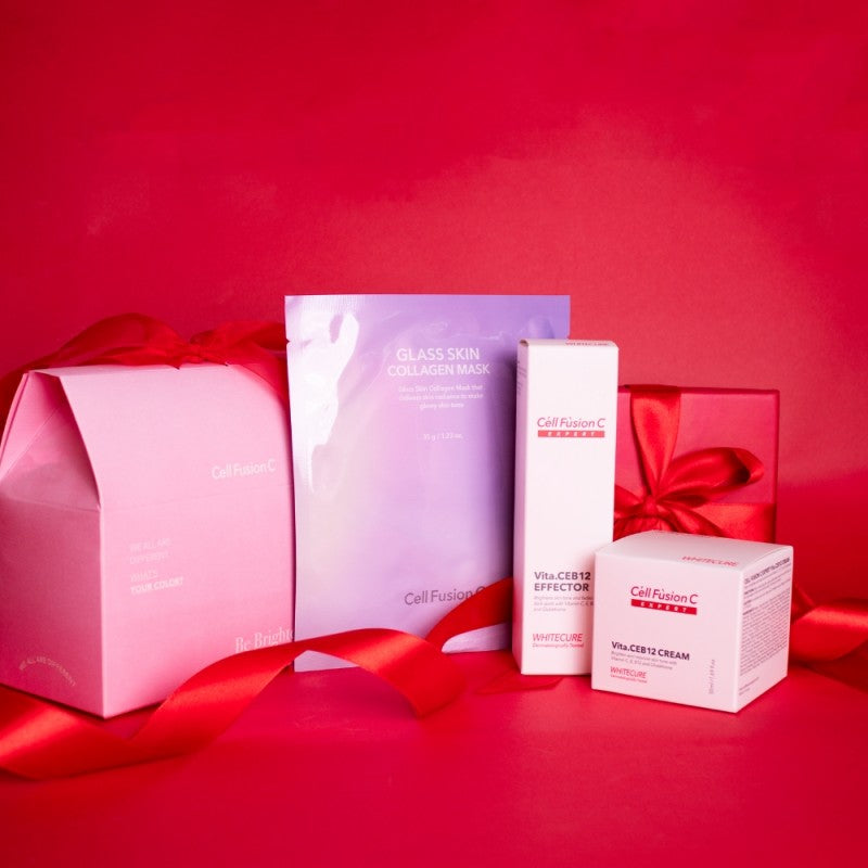 CELL FUSION C EXPERT šventinis rinkinys odos spindesiui rožinėje dėžutėje "WHITECURE", 4 VNT