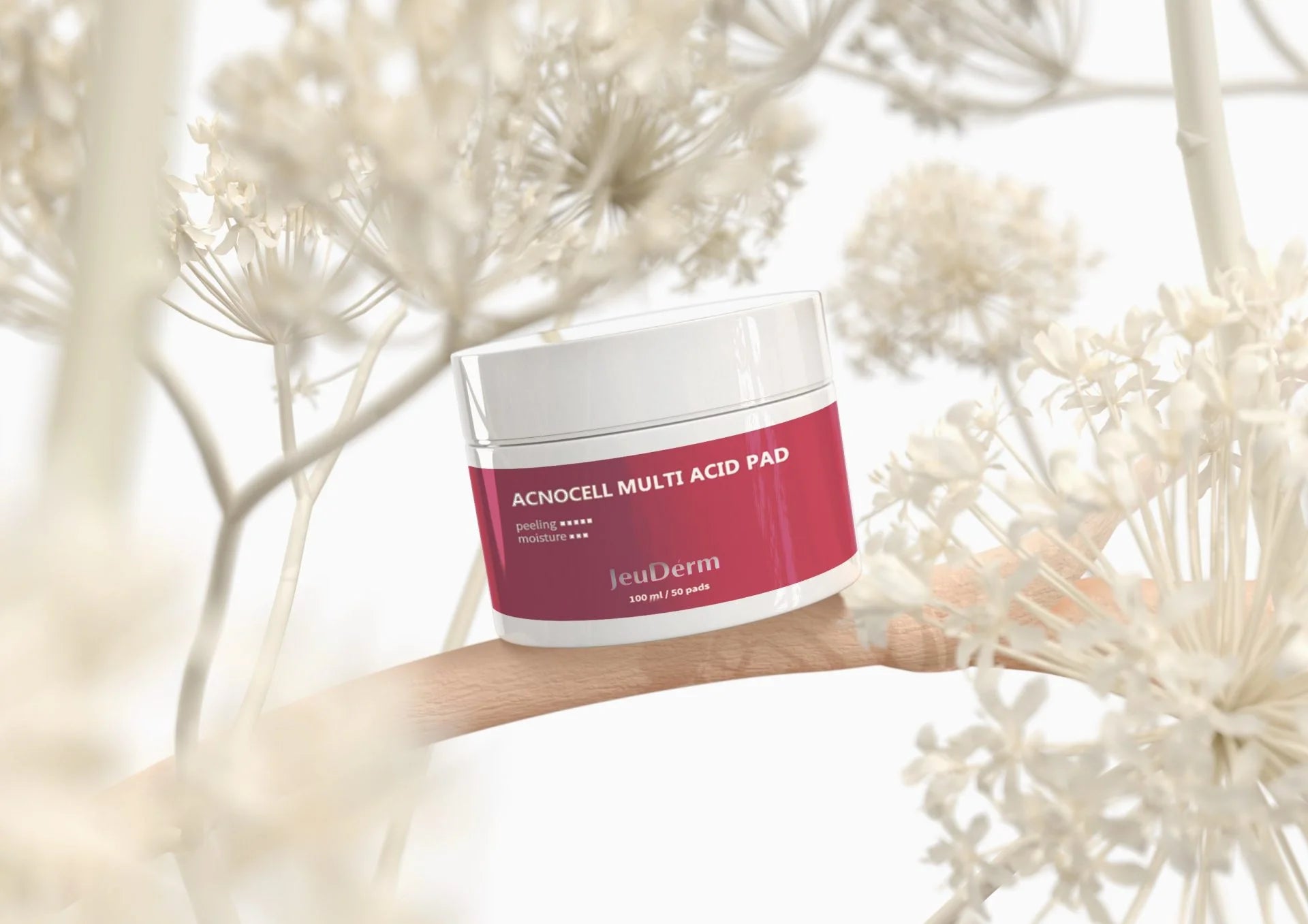 JeuDerm rūgštiniai padeliai MULTI-ACID PAD, iš AcnoCell produktų linijos, giliai eksfolijuoja odą ir pašalina negyvas ląsteles. Specialus raminamasis kompleksas suteikia raminamąjį ir drėkinamąjį poveikį. Tai antrasis aknės pažeistos odos priežiūros žingsnis namuose. Reguliarus naudojimas padidina kitų aknės pažeistai odai skirtų produktų veiksmingumą. Padeliai turi šiurkštų paviršių, kuris stipriau pašalina suragėjusias odos ląsteles ir švelnią pusę, kuri mažiau eksfolijuoja. Sudėtyje esančios rūgštys neleidžia daugintis spuogeliams, padeda atkurti odos barjerines funkcijas, šviesina susidariusias pigmentines dėmeles ir neleidžia formuotis naujoms.